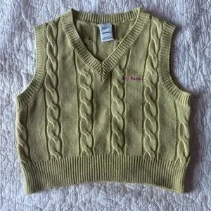 Cute and Stylish Light Green V-Neck Cropped Sweater Vest. From the Iets Frans brand that is sold at Urban Outfitters. Features a classic cable knit design, perfect for layering! The sweater is like new in good condition only worn a few times.