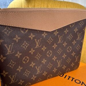 This is an authentic LOUIS VUITTON Monogram Daily Pouch in Sesame. This pouch is crafted of traditional monogram leather with a light brown trim. The zipper opens to a matching microfiber interior with a patch pocket.