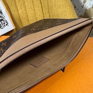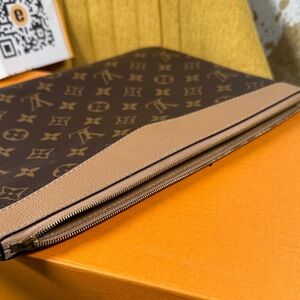 Condition: missing zipper can be taken to luggage shoe repair shop easy to replace. In good condition with normal wear. Interior ink marks noticeable but can be clean with stains remover and exterior don’t see any scartches just very tiny to not too visible scratches lovely pouch. Can be altered as a crossbody shoulder bag. You’ll love this one .