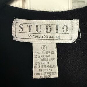 Elegant black cardigan with intricate detailing. 70% Lambswool 20% Angora 10% Nylon. Soft and comfortable fabric.