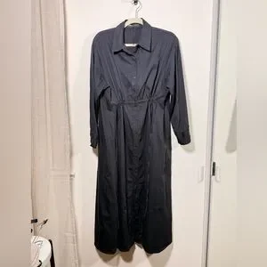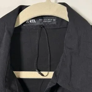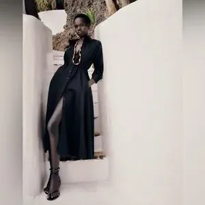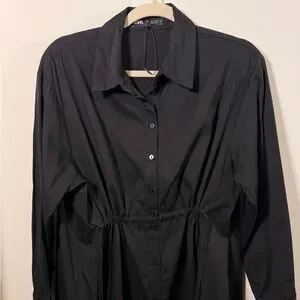 Zara black cotton poplin dress in size Medium. Adjustable cinching in front, button downs the front, pockets(!!), slits on side. Super fun dress! Worn once on vacation