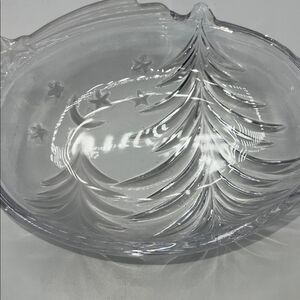 This bowl is a sturdy glass candy dish that measures 7" x 5.5". It features a lovely design with two trees, a crescent moon, and five stars. The upper left corner of the bowl is frosted glass, and one of the trees is also frosted. Excellent condition.
