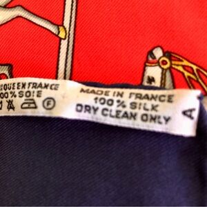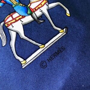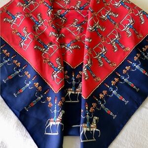 Stylish authentic Hermes silk twill scarf featuring a vibrant equestrian print. Dominant colors are red and blue. The scarf is 90 cm square about 34” in perfect condition with no stains or holes.