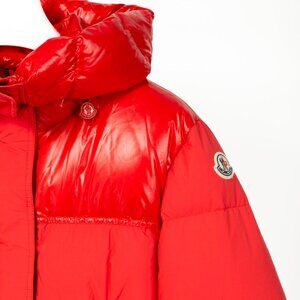 Made in Armenia, this Etival jacket from Moncler circa 2022 is made with a matte Red quilted nylon taffeta filled with goose down, and is trimmed with a tonal shiny nylon on the hood and yokes. It features long sleeves with zips on the undersides, elasticated cuffs, a funnel neck with a drawcord hood, a front two-way zip fastening with a snap placket, two front snap pockets, drawcords on the back yoke and hem, tonal nylon lining; and is embellished with an embroidered beige, navy and red brand patch on the sleeve.