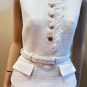 polka dot print skirt brings light-hearted ease to this fit-and-flare midi dress. Its cream bouclé top and belted waist exude elegant poise – add heels for work cocktails and trips to the opera.