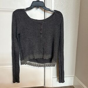 Chic charcoal top with button accents. Features a delicate lace hem. Perfect for versatile styling.