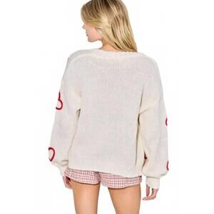 This oversized, chunky open-knit cardigan features a deep V-neck and red heart appliqués on the body and sleeves. Measured for a loose fit, it is designed for layering during the holiday and Valentine's Day seasons.