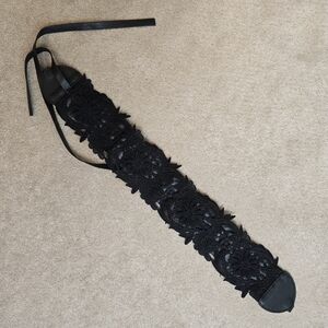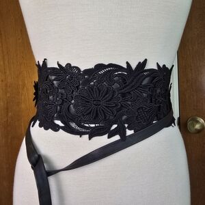 This women's faux leather lace wrap around obi belt in black is a stylish and versatile accessory. The wide belt features a solid pattern with lace accents, giving it a unique and trendy look. Made in the United States, this one-size belt is perfect for adding a touch of boho flair to any outfit. The wrap-around design allows for a comfortable fit, making it a chic addition to your wardrobe.