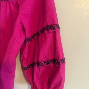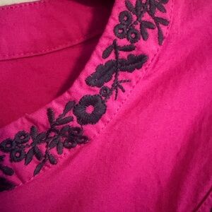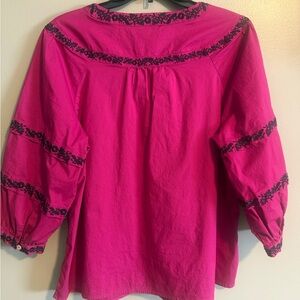 Chic fuchsia blouse by Talbots. Features elegant black embroidery. Ideal for versatile styling. Approximate flat measurement pit to pit 20, length 25