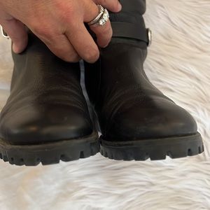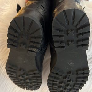 Bought at Nordstrom. Excellent condition. Side zip with strap/buckle. 1.25โ heel with lug rubber sole. Shaft is approximately 15โ from heel to top of boot. Approx shaft circumference 14โ with elastic dart.