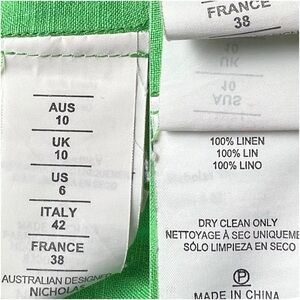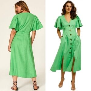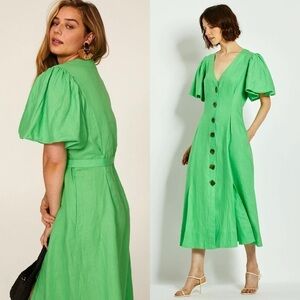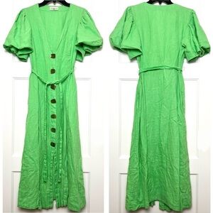 NICHOLAS Lime Linen Puff Short Sleeve V-Neck Tie Waist Button Front Midi Dress 6