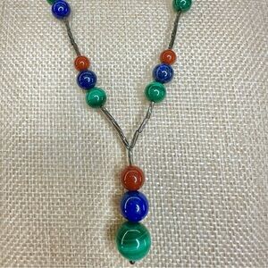 Liquid Silver Sterling Malachite Lapis Carnelian Natural Gemstone Lariat Necklace Vintage