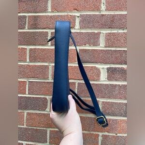 9” wide, about 5 1/2” depth inside the bag, 1” wide at the bottom of the bag, strap adjusts to 22 1/2” in length