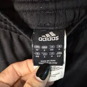 Comfortable black track pants with Adidas logo. Perfect for workouts or casual wear.