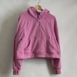 Stylish magenta half-zip Lulu scuba hoodie. Silver details on sleeves. Ideal for everyday comfort.