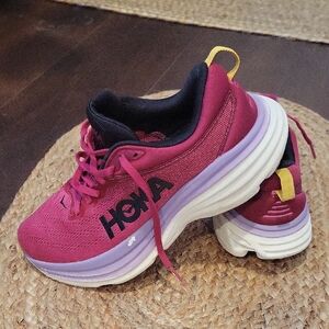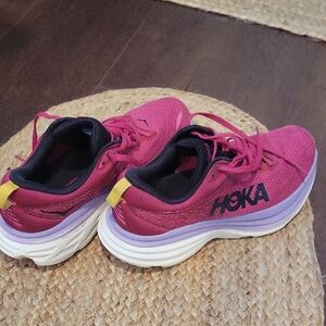 Dynamic pink Hoka shoes with yellow highlights. Perfect for active lifestyles.