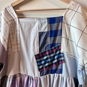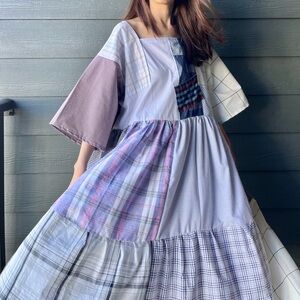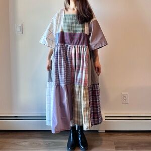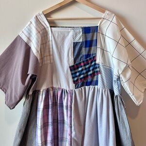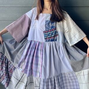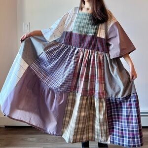 Details: This handmade patchwork dress is thoughtfully crafted using a mix of high-quality new and recycled cotton fabrics in plaid patterns. Designed with a square neckline, wide sleeves, and an easy pull-on style, it offers a relaxed, comfortable fit—perfect for a casual or boho-inspired look. Unlined, pull-on style, pre-washed, and fully serger-finished for durability. Designed to be worn to either side.
