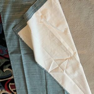 37" W x 84" L..four panels of black out curtains with thermal insulation and large rings at the top for easy mounting onto rod. Color is a turquoise with bits of grey and black. Like new!