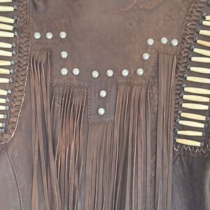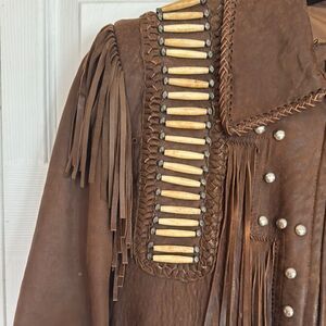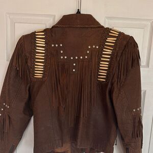 Stylish brown leather jacket with fringe. Features unique beadwork on the front. Perfect for a bold look.