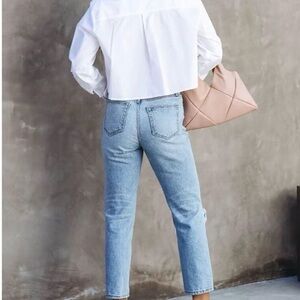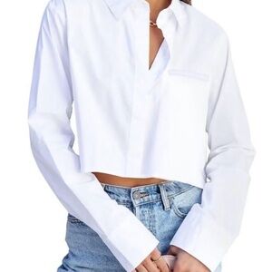 Classic white long-sleeved cropped collared shirt. It comes with a fitted cropped tank that can be worn separately or together, or open for a layered look. Perfect to style with many outfits, such as under sweaters, with jeans, pencil skirts, or satin skirts.