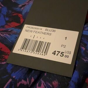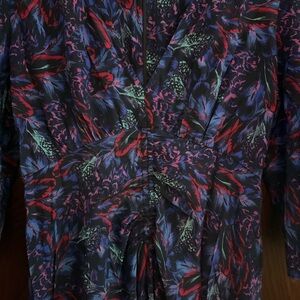 Gorgeous feather print red and blue silk mini dress by The Kooples. Sold out online. Retails for $475. French size 1, which translates to a small. Three quarter length sleeves. Lined skirt. Zip up back. Much more beautiful in person. Lightweight. Ptp measures 18”. Waist measures 15”.