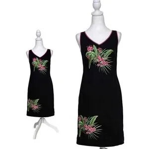 Elegant black dress featuring vibrant pink floral embroidery. Perfect for any occasion.
