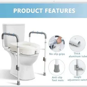 ADDED 5" of HEIGHT & with HANDRAIL:The raised toilet seat adds 5 inches of height to your toilet seat and features safety grab bars to make it easier and safer to sit or stand.