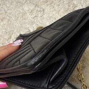 Stylish black leather crossbody bag. Features gold chain strap. Iconic Tory Burch design.