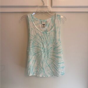 Set of four tank tops. Includes pink striped with bold text, solid pink, blue tie-dye, and solid pink racerback. Soft and lightweight. Great condition.