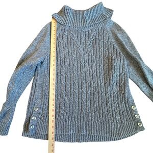 Wrap yourself in cozy sophistication with this Talbots blue cable knit sweater. The luxurious cowl neck drapes elegantly, framing your face with warmth and style. Intricate cable knit detailing adds a timeless texture, while the relaxed fit promises ultimate comfort. Silver-toned hardware accents on the side seams add a subtle touch of polish. Perfect for a casual day out, a cozy evening by the fire, or a chic office ensemble. Sweater is in excellent preowned condition with no holes or stains. See measurements in photos.