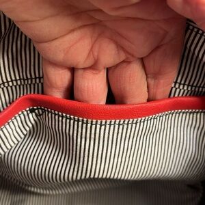No Brand Red bow and red straps purse with gray, tan beige, white and gray. Purse is wipeable. Red long straps are detachable. Two pockets inside and a zipper pocket. Zips to close. Measures 16 by 10 inches.