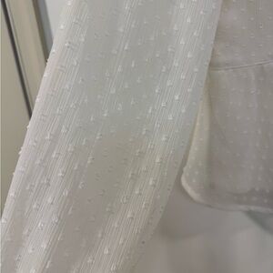 Elegant white blouse with tie-front detail. Features a deep V-neck and long sheer sleeves. Ideal for any occasion.