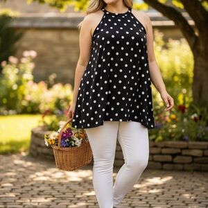 polka dot tunic, swing top, halter tunic, sleeveless blouse, black white top, flowy tunic, plus size chic, leggings top, minimalist style, capsule wardrobe, classic print