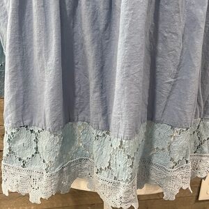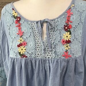 Beautiful boho embroidered peasant top in soft light blue. Floral embroidery on the chest, lace panels, tie neckline, and flowy silhouette. No size tag but fits like an XL based on measurements.