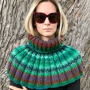 This turtleneck shawl circular shaped accessory was knit by hand with luxury fibers from specialty yarn shops which are out of production worldwide. The chunky, soft, airy wool fibers have an organic look & texture which stripes in hues of green with rusty/reddish brown purple & white. It stretches from size small to large. This extraordinary and colorful piece looks the same in front and back. Just pop it on over your head and you are ready to go. Each piece created with this yarn stripes uniquely. Wear this outdoors over an outfit or under a coat & indoors over a top or dress for a casual or dressy look. Add jewelry, of course! Mona’s Collection jewelry and knitwear are sold at art shows. 🌾🐞Place your selection(s) in a bundle and include a listing of the gift wrapped with a ribbon in order to receive a private offer.🍃 Fiber Content: 100% wool. (K57-16H)