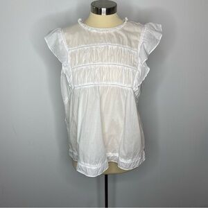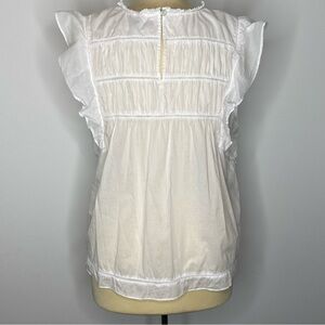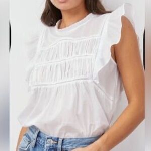 Rails Bright White Filomena Flutter Sleeve Blouse. Elevate your wardrobe with this feminine flutter sleeve top made from breathable beach cotton. Untucked or tucked into your favorite jeans, this cap sleeve top features a delicate lace inset, pleated detailing and a keyhole closure at back. New without tags. Stock photos included to show fit.