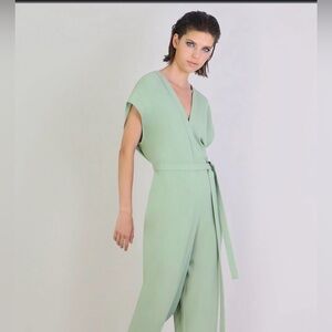 Chic light mint green maxi jumpsuit by Missi London. Features a flowing design with a stylish waist tie. The fabric is polyester elastine so there’s some stretch to it. It’s in like new condition and there are no signs of wear. The size label is UK 12 = US 8 or medium but to me it runs small.
