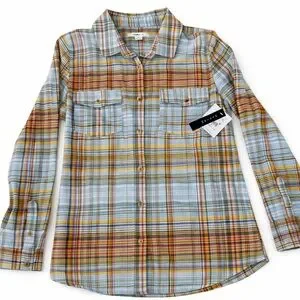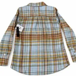 Vibrant plaid shirt with button-down front. Features a mix of warm and cool tones. Ideal for casual wear.