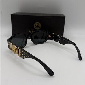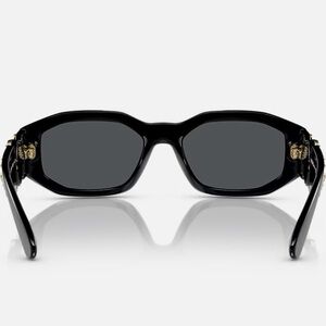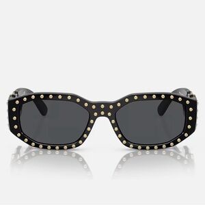 The Versace Biggie sunglasses feature an irregular shape that adds a touch of modernity to the design. Crafted in black color, these unisex shades boast solid dark grey lenses that provide optimal protection from harmful UV rays and ensure excellent vision in all light conditions. Designed with saddle bridge for enhanced comfort, they offer you both style and functionality.