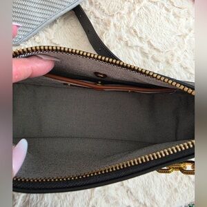 Sleek black leather wristlet. Accented with a bold gold chain. Perfect for versatile styling.