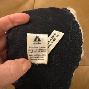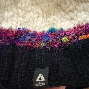 Chunky knit pom-pom hat. Featuring a blend of cream and black with a band of fuschia-dominant multi-coloured yarn. Fleece headband lining for comfort. 90% wool.
