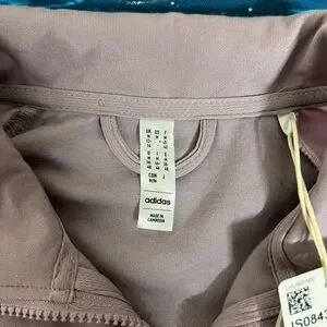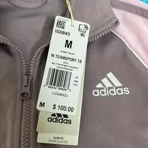 (M S R P $100) Chic Adidas track jacket in lavender and light pink. Elevate your everyday sporty style with this Adidas women’s zip-up track jacket. Designed with a sleek cropped fit, it features a soft mauve-gray body paired with blush pink sleeves and the iconic three-stripe detail running down the arms. The full-zip front and stand collar offer a flattering, versatile look that’s easy to layer, while the lightweight, stretchy fabric ensures all-day comfort. Finished with the classic Adidas logo on the chest, this jacket is perfect for workouts, casual wear, or athleisure styling.