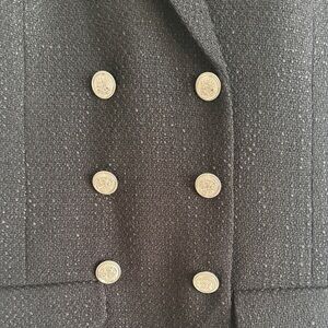 Chic black dress with a textured finish. Features a sleeveless design and stylish buttons.
