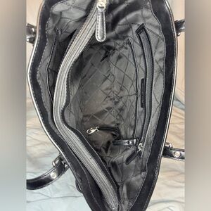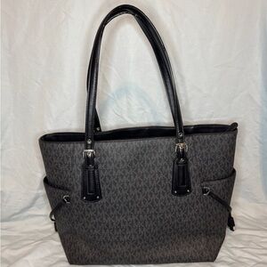 Classic Michael Kors signature tote in timeless black/charcoal MK logo coated canvas with black leather trim. A perfect everyday bag with plenty of room for work, travel, or errands.