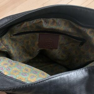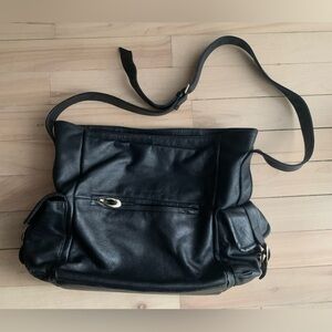Elevate your style with the TOSCA black leather shoulder bag, made in Italy. In good used condition. Has a unique inside fabric pattern. Roomy bag with a distinctive 90s look. Adjustable strap to wear over shoulder or cross body.