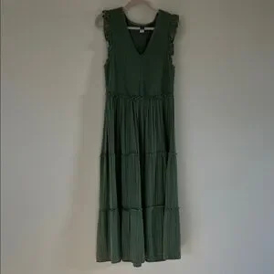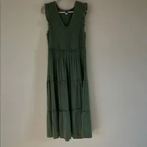 Chic green midi dress with ruffled sleeves. Features a V-neck and tiered skirt. Ideal for casual outings.