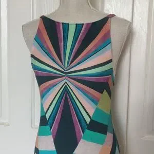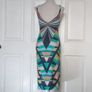 The Mara Hoffman Prism V Back Dress in Teal Multi is a bodycon style dress with a mid length hem. Featuring a high front neck with low exposed back and a hidden side zipper. Vibrant midi dress with geometric patterns. Features shades of green, purple, and orange. Perfect for a bold statement look.