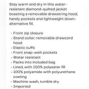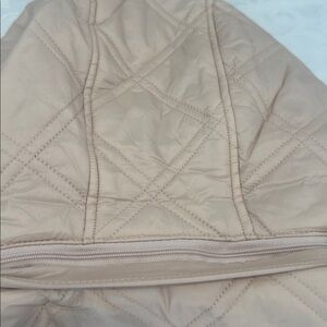 NWT Kate spade water resistant coat. Diamond shaped quilted zip up coat in Champagne with gold hardware. Lightweight fill, removable drawstring hood, stand collar, elastic cuffs, front snap welt pockets. 100% polyester material. Comes with matching packing sack! Ladies size L.