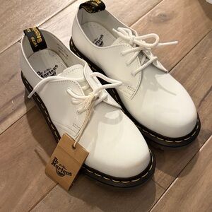 Crisp white leather oxfords by Dr. Martens. Features iconic black/clear gum sole with yellow stitching. Perfect for a classic look. Gorgeous shoe. Fits like a 6.5/7.