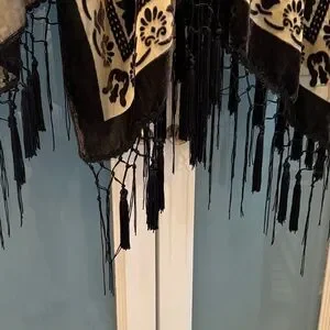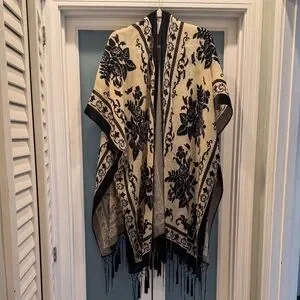Chic floral shawl with intricate black patterns. Perfect for stylish layering. Some fringe missing along bottom